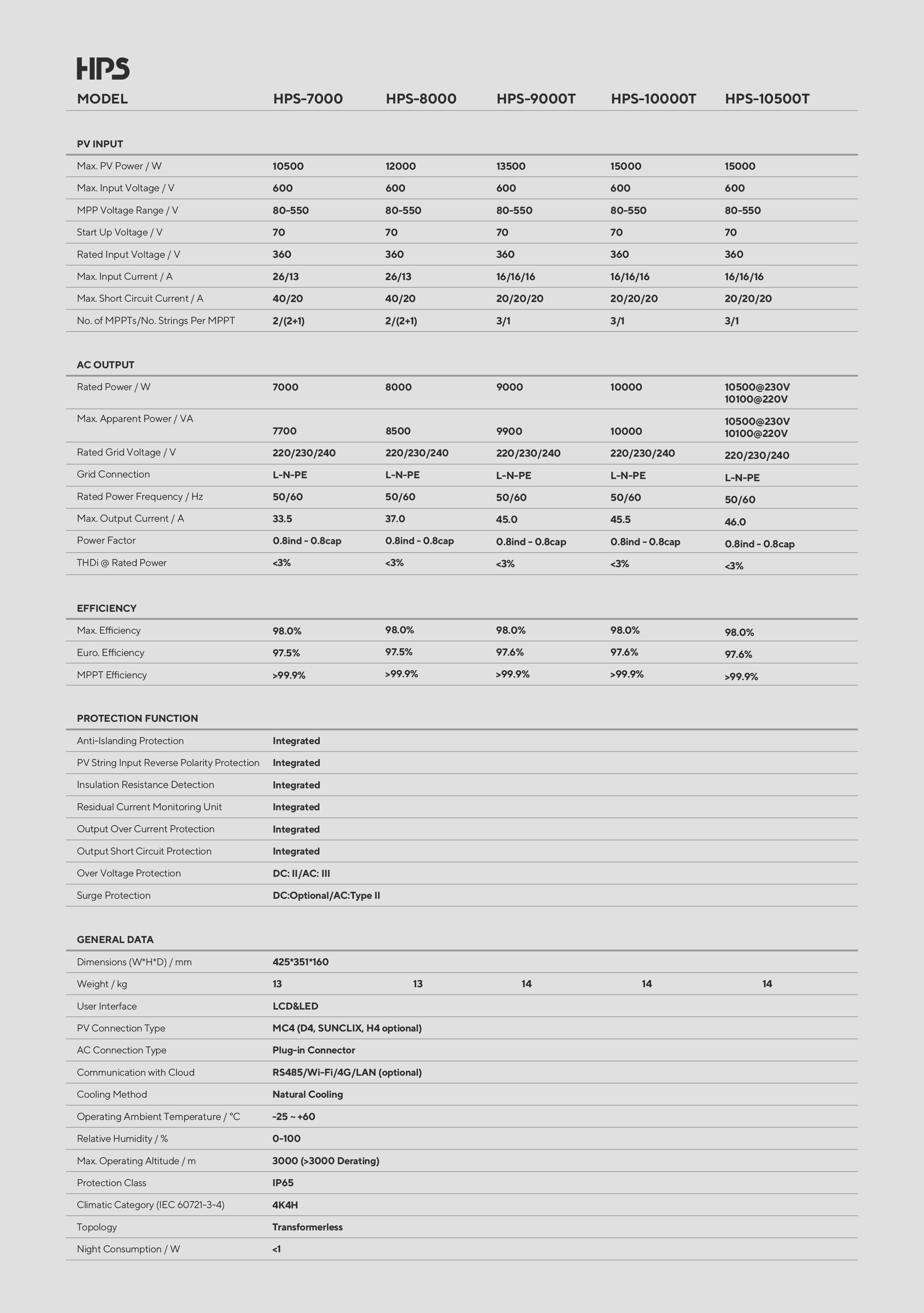 Biến tần hòa lưới bám tải 1 pha 8 kW HYPONTECH HPS-8000 được trang bị hàng loạt tính năng hiện đại, đưa nó trở thành một trong những sản phẩm nổi bật nhất trên thị trường. Từ hiệu suất chuyển đổi năng lượng đến khả năng bảo vệ và giám sát thông minh, mọi khía cạnh của HPS-8000 đều được thiết kế để mang lại trải nghiệm tốt nhất cho người dùng.