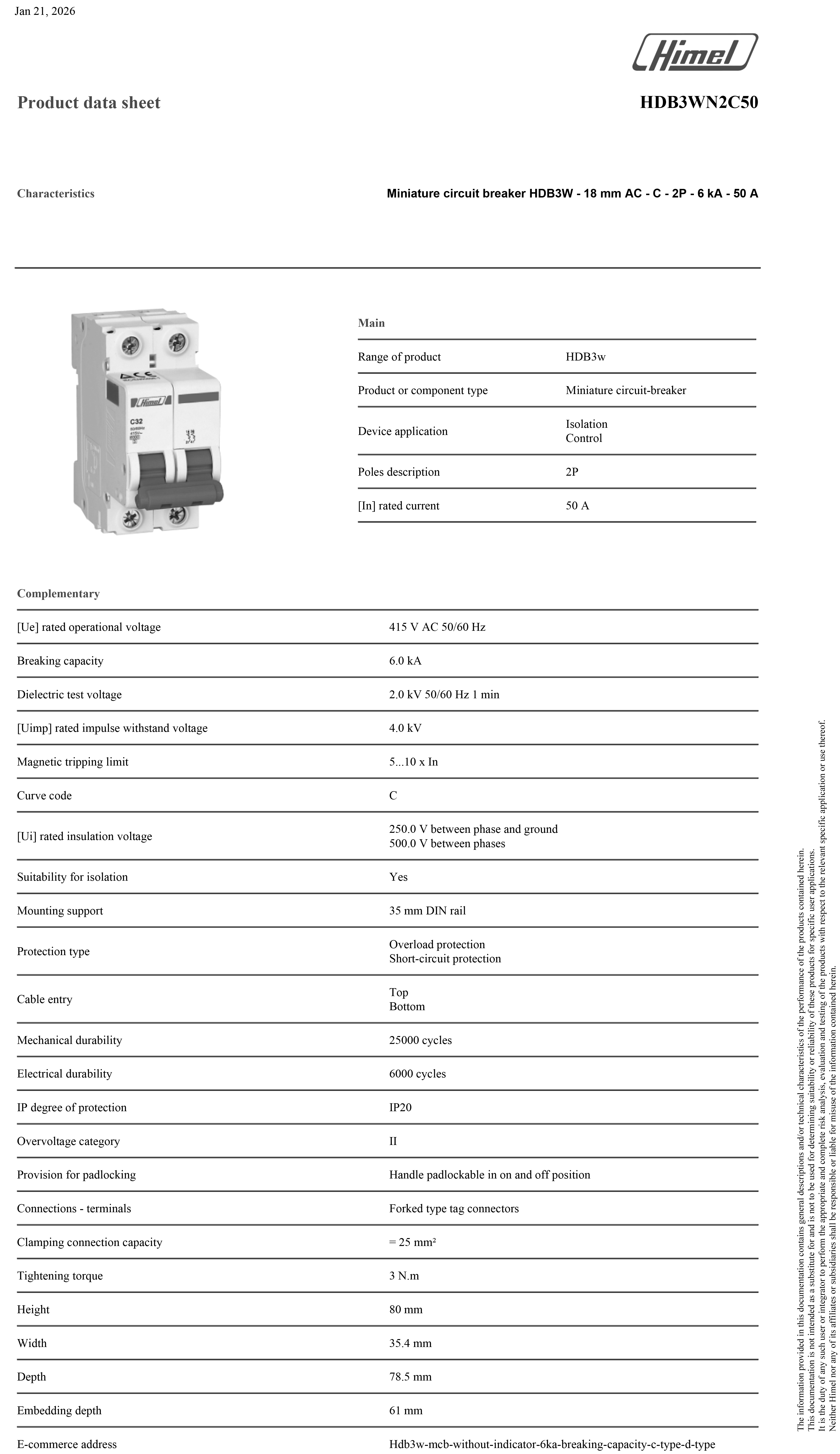 Cầu dao tự động HIMEL MCB 2P 50A HDB3wN2C50 được thiết kế với những tính năng ưu việt, đảm bảo hiệu suất hoạt động cao và độ tin cậy tuyệt đối trong mọi điều kiện vận hành. Sản phẩm này là kết quả của quá trình nghiên cứu và phát triển không ngừng nhằm mang đến sự an tâm cho người sử dụng.