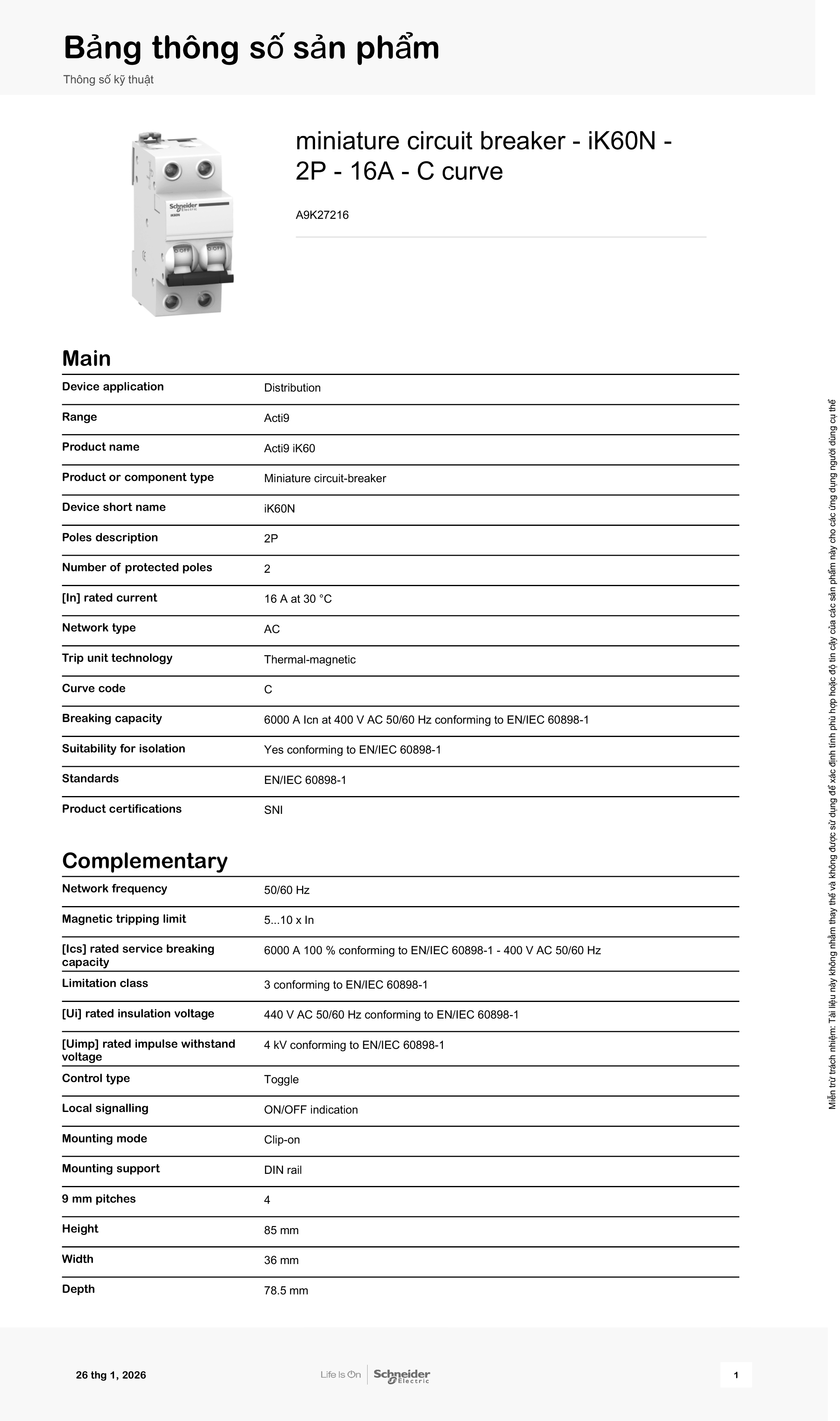 • Tiêu chuẩn: EN/IEC 60898-1