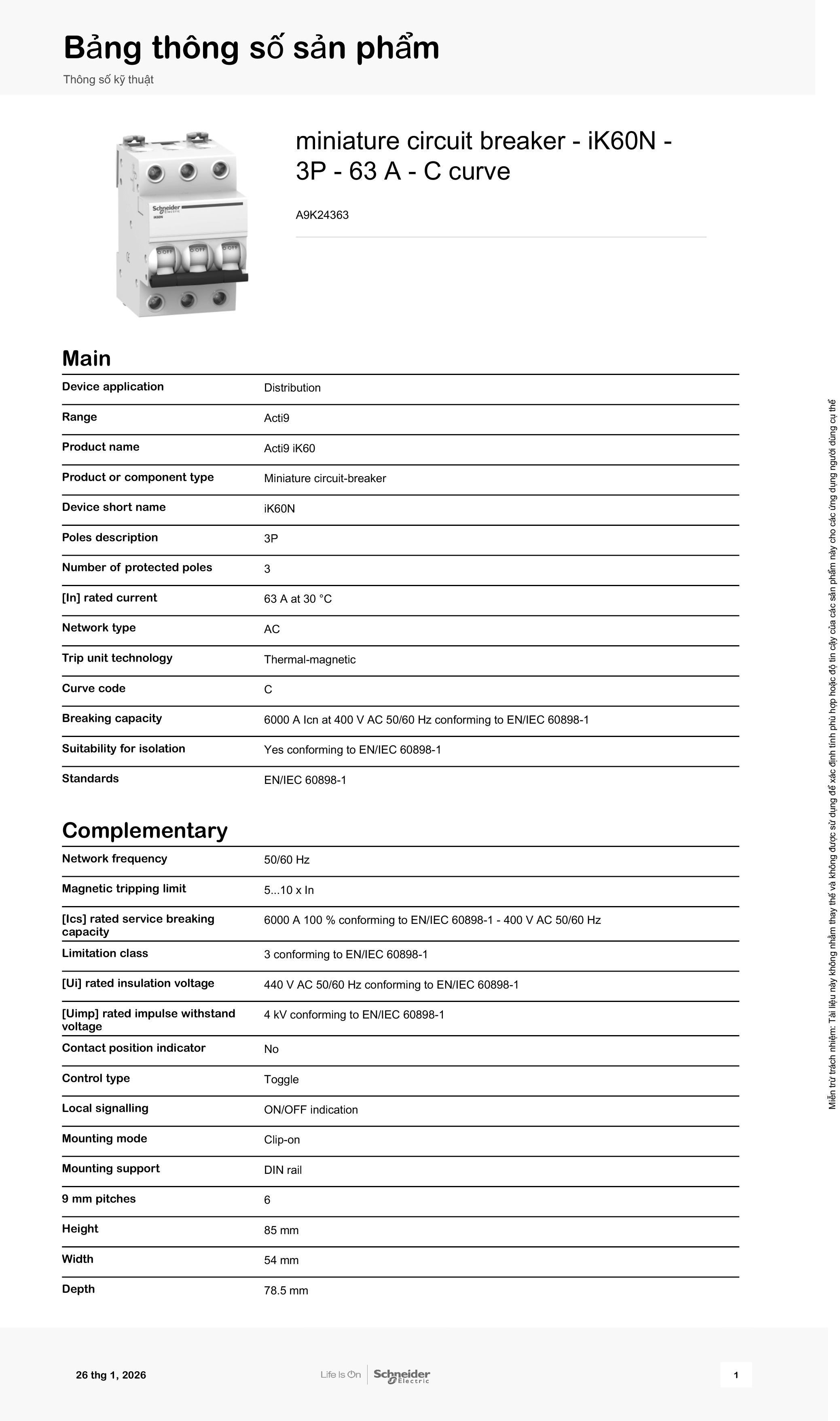 • Tiêu chuẩn: EN/IEC 60898-1