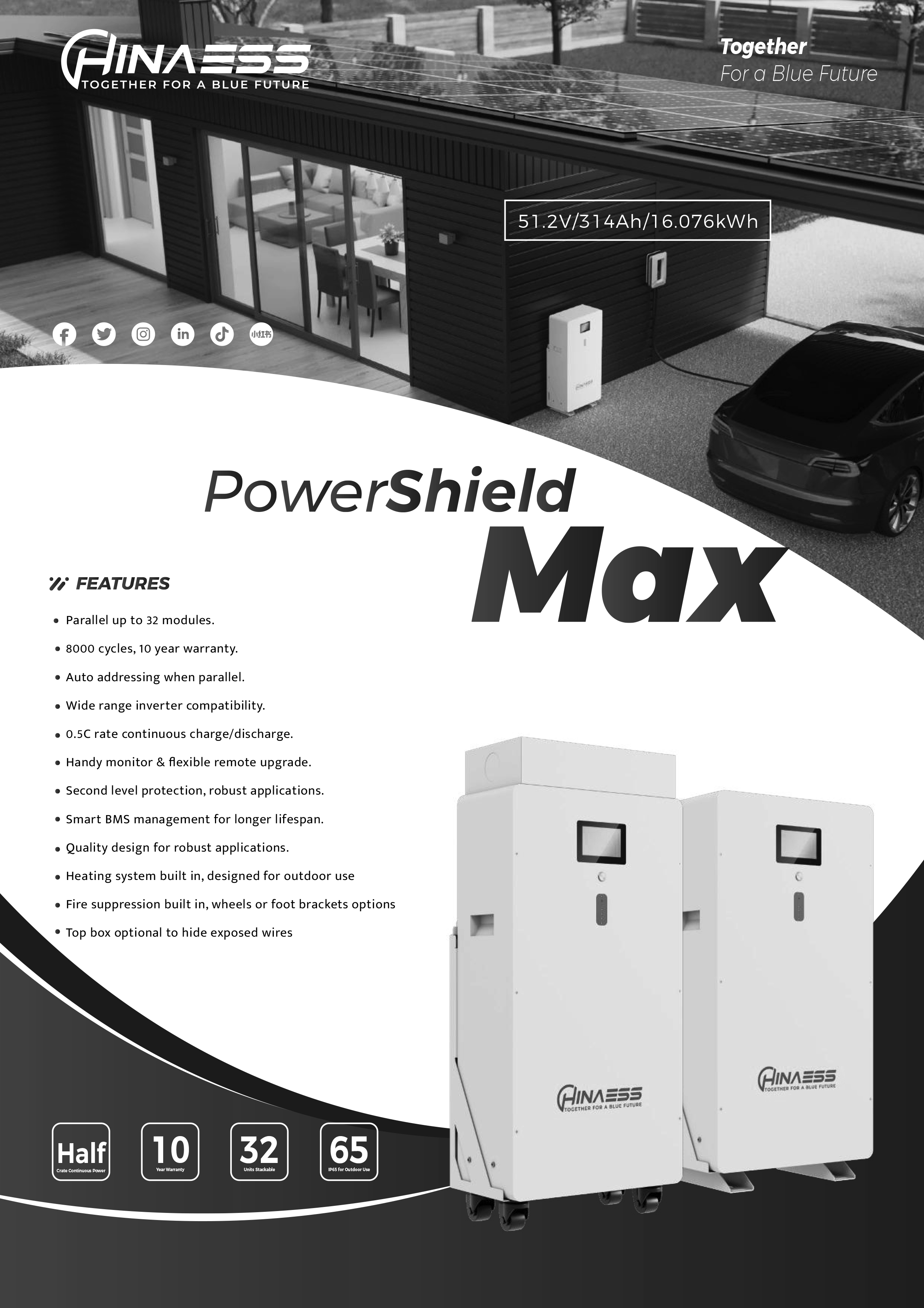 Thiết kế của HinaESS 16.076kWh PowerShield Max không chỉ chú trọng đến tính năng mà còn đến sự tiện lợi và thẩm mỹ. Kích thước nhỏ gọn, thiết kế module cho phép lắp đặt linh hoạt, dễ dàng mở rộng dung lượng khi nhu cầu năng lượng tăng lên. Giao diện người dùng trực quan, có thể theo dõi qua ứng dụng di động hoặc màn hình hiển thị, giúp chủ sở hữu dễ dàng kiểm soát và quản lý năng lượng trong ngôi nhà hoặc cơ sở kinh doanh của mình. Sự kết hợp giữa công nghệ cao và thiết kế tinh tế giúp PowerShield Max trở thành một phần không thể thiếu của mọi không gian sống và làm việc hiện đại.