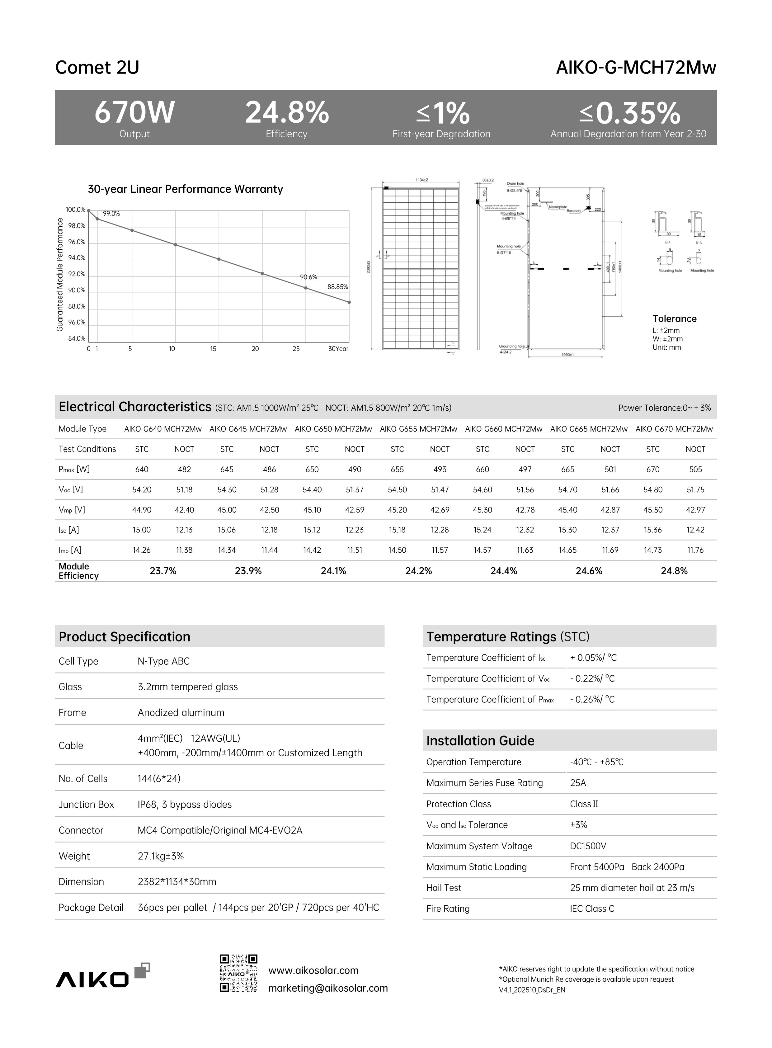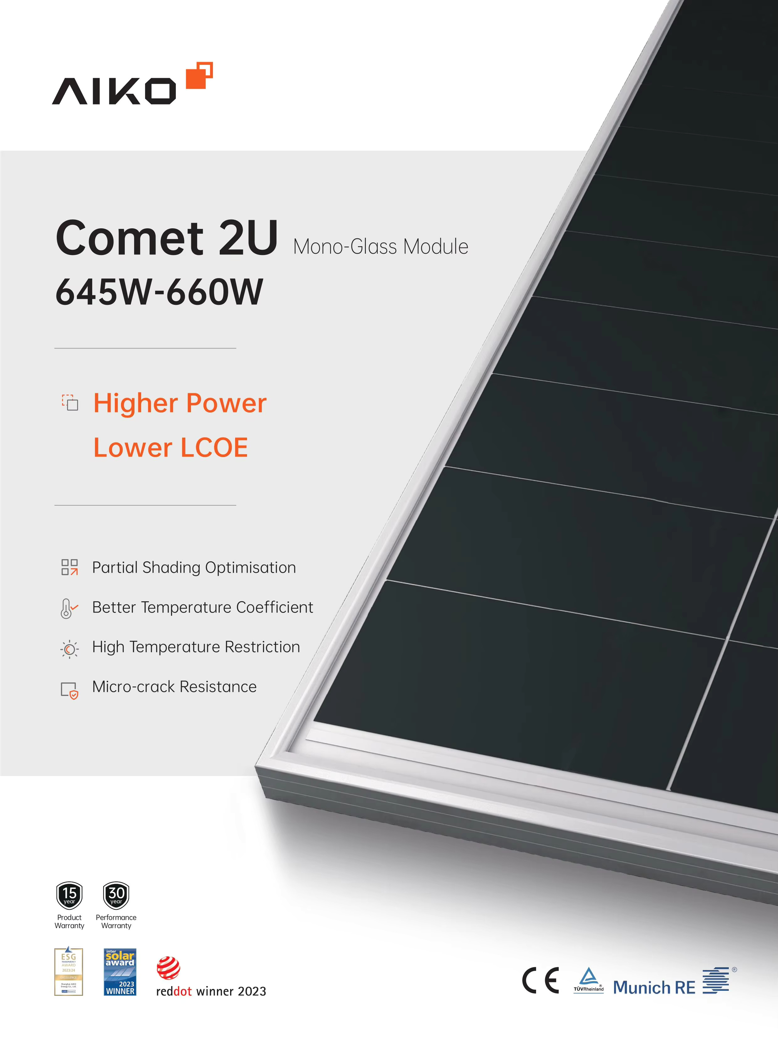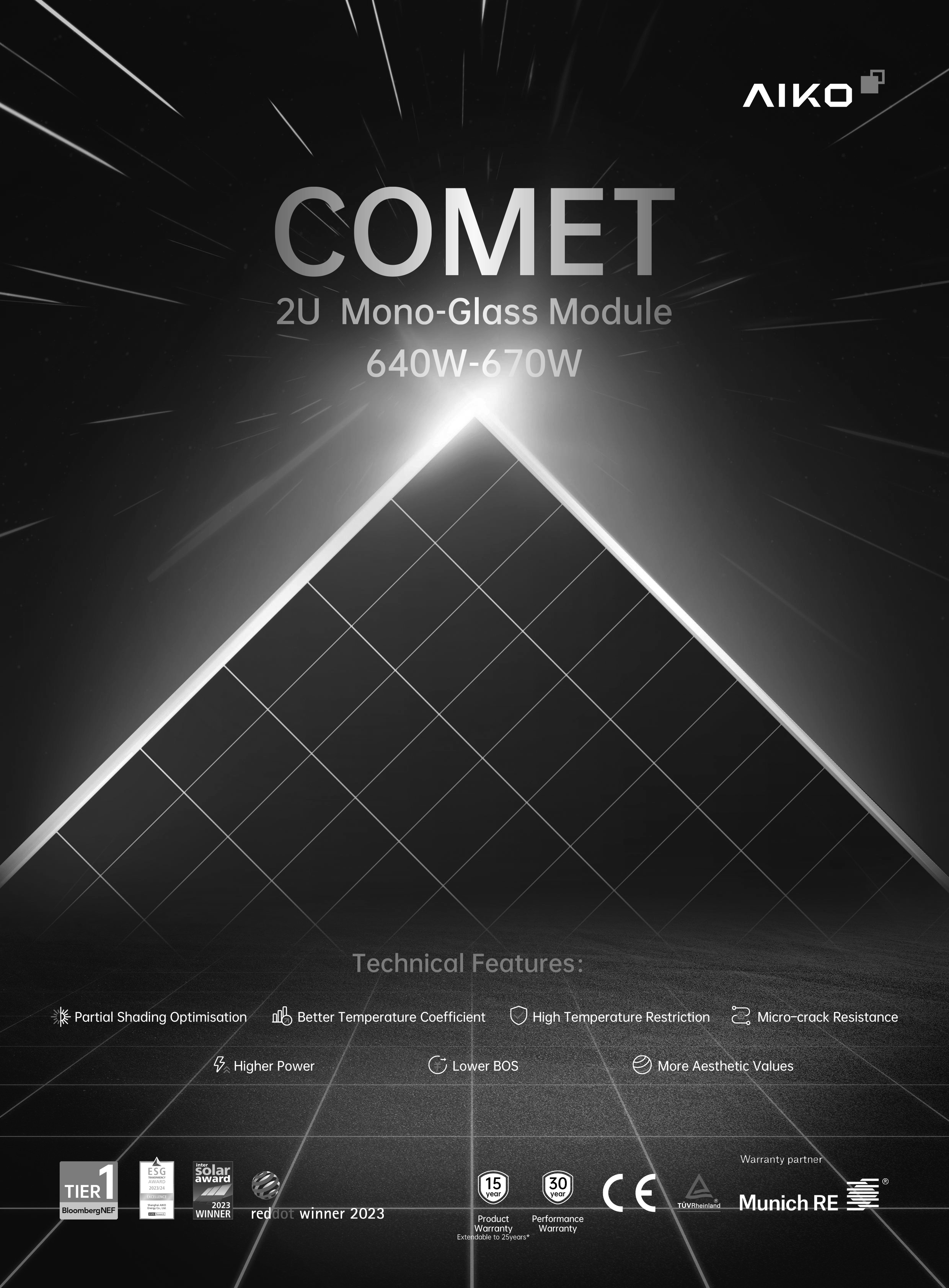 Với công suất ấn tượng 660W, tấm pin AIKO Comet 2U72 G660-MCH72Mw đại diện cho thế hệ pin năng lượng mặt trời tiếp theo, được thiết kế để tối đa hóa lượng điện sản xuất trên mỗi mét vuông. Sản phẩm này đặc biệt phù hợp cho các hộ gia đình, doanh nghiệp và các dự án công nghiệp quy mô lớn, nơi yêu cầu về hiệu suất và độ tin cậy là ưu tiên hàng đầu. Sự xuất hiện của AIKO Comet 2U72 660W mở ra kỷ nguyên mới cho việc khai thác năng lượng mặt trời, giảm thiểu chi phí đầu tư và vận hành trong dài hạn.