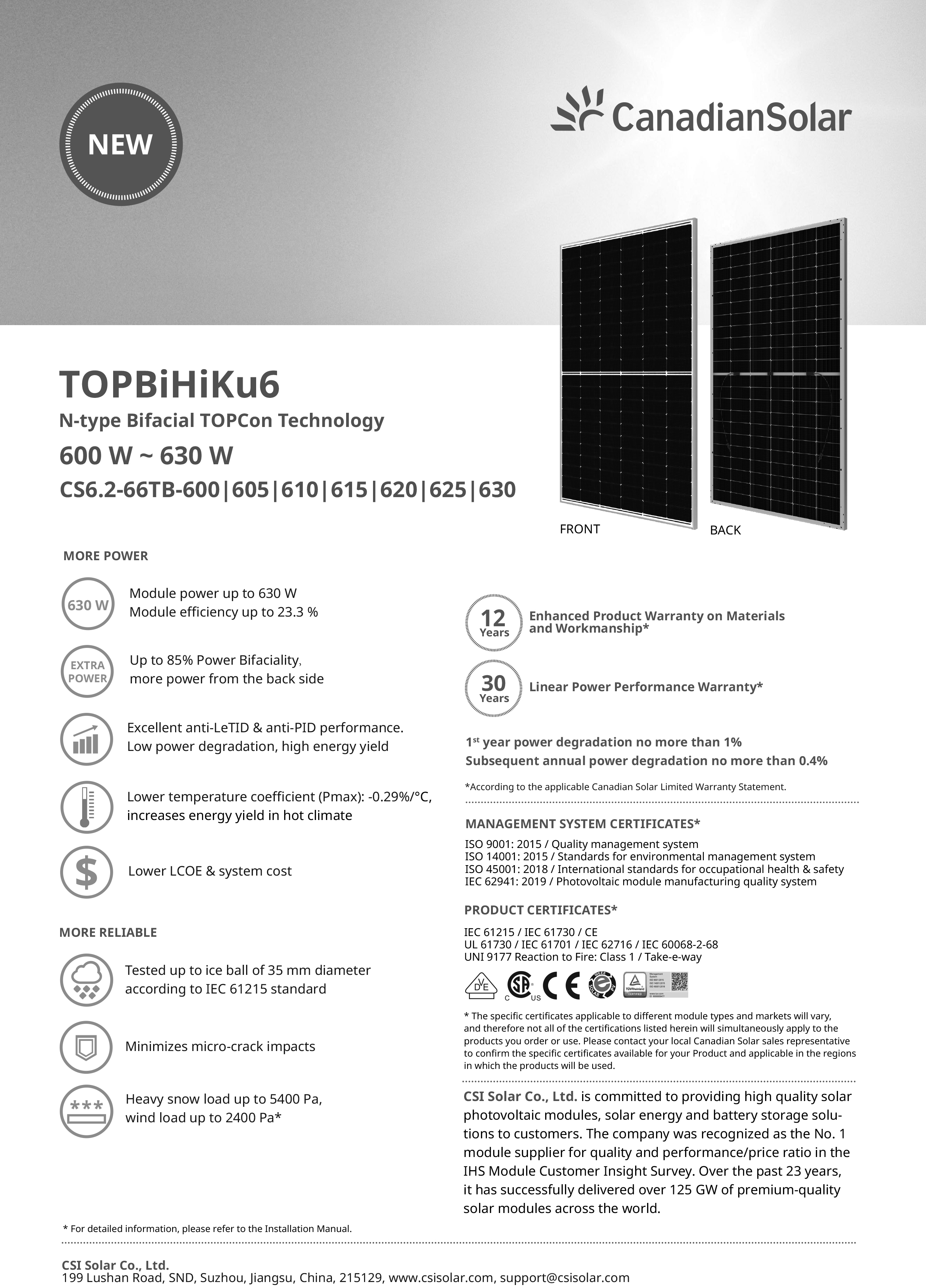 Tấm pin Canadian Solar 620W CS6.2-66TB-620 được hưởng chế độ bảo hành sản phẩm lên đến 12 năm và bảo hành hiệu suất tuyến tính 25 năm, đảm bảo hiệu quả đầu tư trong suốt vòng đời của hệ thống. Đây là minh chứng rõ ràng nhất cho niềm tin của nhà sản xuất vào chất lượng và độ bền của sản phẩm.